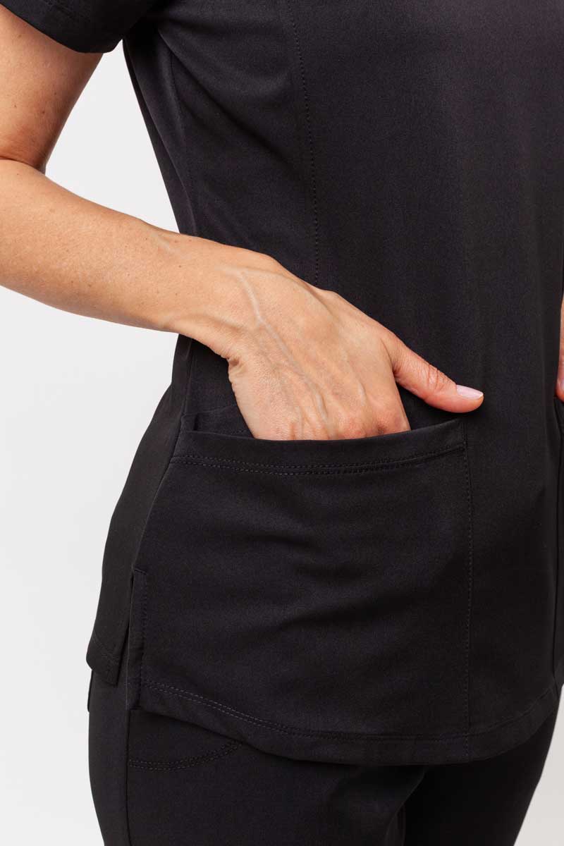 Sú také blúzy, ktoré si chceš obliecť hneď, ako ich uvidíš – spájajú totiž pohodlie a štýl bez zbytočných komplikácií. Monica je presne taký model – kombinuje elegantný výstrih do písmena V s jemným prešívaním, ktoré tvaruje postavu a dodáva jej ľahkosť. Pohodlná, elastická tkanina s funkciou odvádzania vlhkosti ti zabezpečí pocit sviežosti aj v rýchlom tempe dňa. Vrecká pojmú všetko potrebné – telefón, pero či malé poznámky, ktoré potrebuješ mať po ruke. Táto blúza bude tvoj nový spojenec pri každej službe!