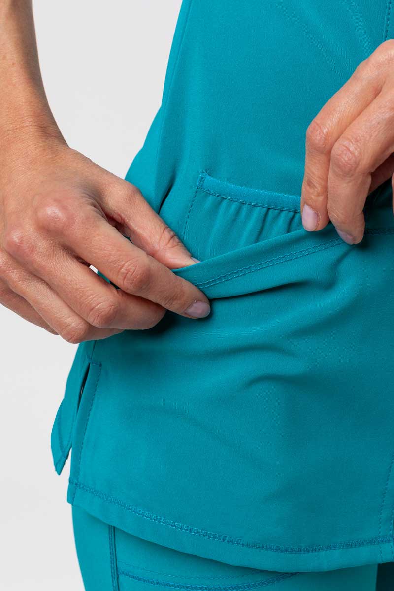 Pohodlné. Módne. Funkčné. Dokonale prispôsobené. Ženský. Je ťažké opísať lekársku súpravu Cherokee Infinity len jedným slovom. Ak by sme však museli, použili by sme slovo "nenahraditeľná". Osvedčí sa v každej situácii. Vďaka použitiu elastického materiálu nohavice a blúzka dokonale sedia, zvýrazňujú siluetu, ale neobmedzujú v pohybe. Vrecká sú povinnou výbavou všetkých zdravotníkov - tu vám nebudú chýbať. Ďalšou zaujímavosťou je špeciálne navrhnuté pútko na preukaz totožnosti v blúzke. Módne prešívanie, rebrovanie, jemné rozparky, vetracie vložky - všetky prvky súpravy sa navzájom dopĺňajú a vyčarujú dokonalý outfit na každý deň v práci.