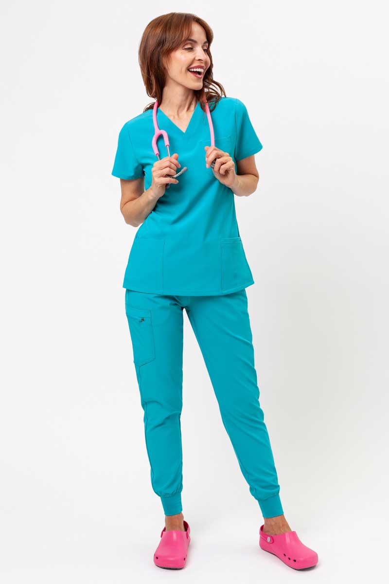 Dobre ušitá blúzka a nohavice s trendovým strihom tvoria dokonalý pár. Taký, ktorý vám umožní pracovať voľne, pohodlne celé hodiny a cítiť sa bezchybne. Ak práve toto hľadáte, súprava Valiant vás zaujme. Ide o kombináciu joggerových nohavíc a blúzky s výstrihom do V, ženským pásom a jemne rozšírenou spodnou časťou. Súprava je vyrobená z recyklovanej tkaniny, ktorá je mäkká, saténová na dotyk, nemačkavá, neabsorbuje vlhkosť a rýchlo schne. Vďaka prídavku spandexu sa dokonale prispôsobí vášmu telu a vašim pohybom, čo zaručuje úplné pohodlie v každej situácii. Súprava Valiant je k dispozícii v niekoľkých žiarivých farbách.