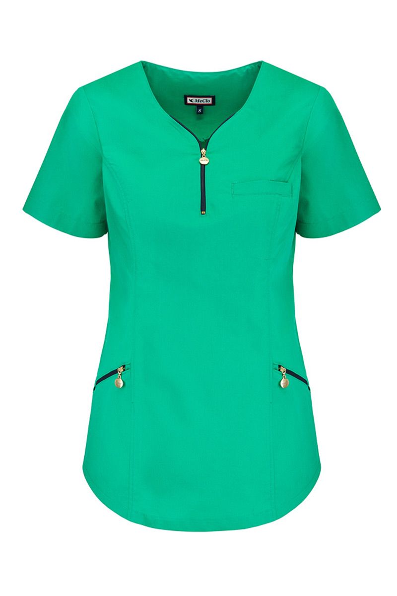 Dámska zdravotnícka blúza s originálnym a praktickým výstrihom. Má tri vnútorné vrecká: jednu v hornej časti na ľavej strane určenú pre pero alebo identifikátor a dve väčšie, pohodlné vrecká so zipsom na spodnej časti. Dolná časť blúzky je Polkruhovitý, s rozparkami po stranách pre väčšie pohodlie pri práci.