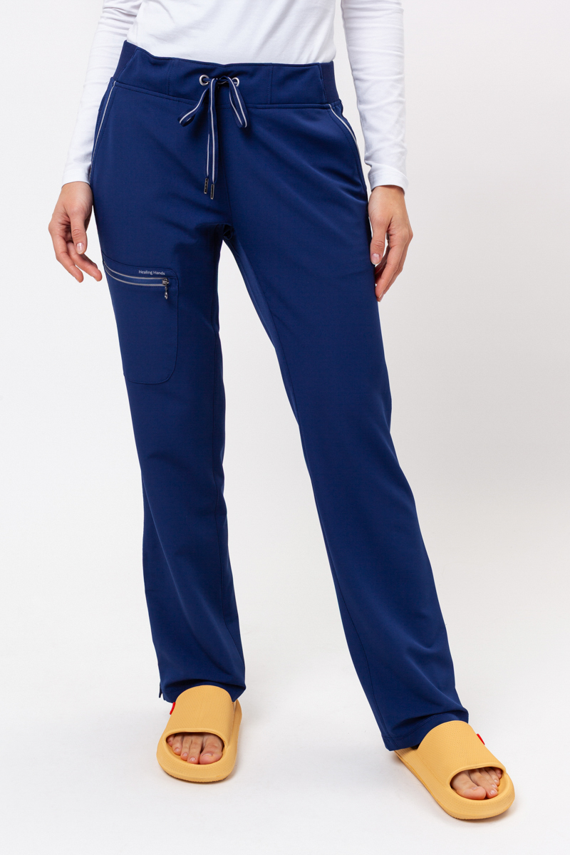 Retro v modernom prevedení – presne tak vyzerajú nohavice Nisha. Rovná nohavica a jemné, mierne reflexné lemovanie pri vreckách a na šnúrke dodávajú modelu charakter a zvýrazňujú líniu strihu. Elastická šnúrka v páse umožňuje prispôsobiť nohavice dokonale postave, zatiaľ čo päť praktických vreciek – vrátane cargo vrecka s kovovým logom – pojme všetky potrebné drobnosti. Mäkká, 4-smerne pružná tkanina odvádza vlhkosť a zachováva farbu bez ohľadu na náročnosť dňa. Nisha sú nohavice, ktoré spájajú funkčnosť, pohodlie a jemne športový retro štýl – ideálne samostatne alebo v kombinácii s blúzkou Sonia či Skyler.