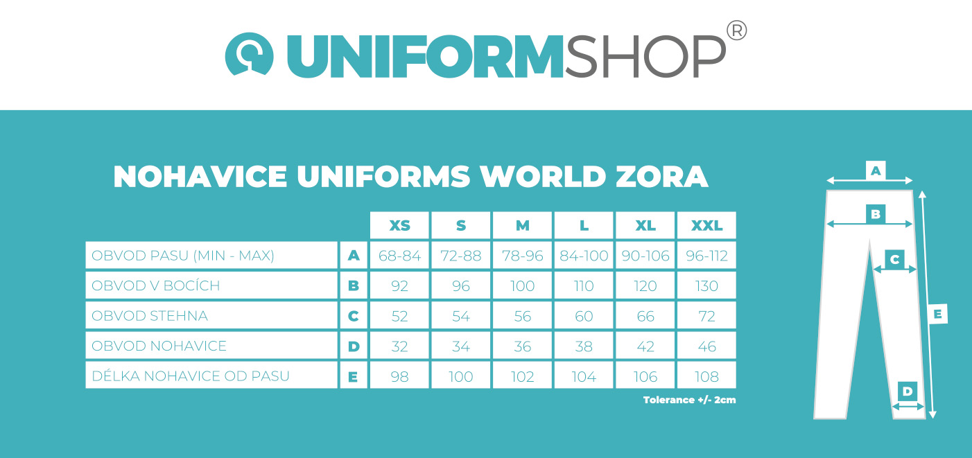 • 2 pohodlné predné vrecká, 2 zadné vrecká + našivka s logom Uniforms World na ľavej strane