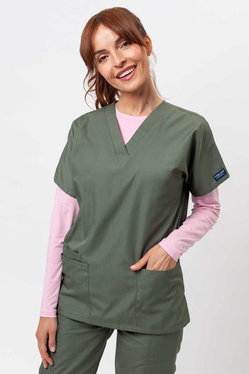 Bola by práca bez vašich obľúbených farieb monotónna? Nebojte sa, bohatá farebná paleta vám umožní prepašovať ich do vášho profesionálneho oblečenia a v kolekcii Cherokee Uniforms Original o farby nie je núdza. Táto súprava je klasického strihu orámovaná jednoduchosťou a eleganciou. Skladá sa z blúzky s výstrihom do V, bočnými rozparky a priestrannými vreckami a nohavíc s jemne zúženými nohavicami, elastickým pásom a originálne riešenými cargo vreckami. Odolná a ľahko udržiavateľná tkanina, ktorú môžete prať na 70 °C, je pohodlná a spoľahlivá na nosenie. Zostáva už len otázka farby. Pre ktorú sa rozhodnete vy?