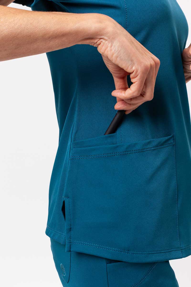 Sú také blúzy, ktoré si chceš obliecť hneď, ako ich uvidíš – spájajú totiž pohodlie a štýl bez zbytočných komplikácií. Monica je presne taký model – kombinuje elegantný výstrih do písmena V s jemným prešívaním, ktoré tvaruje postavu a dodáva jej ľahkosť. Pohodlná, elastická tkanina s funkciou odvádzania vlhkosti ti zabezpečí pocit sviežosti aj v rýchlom tempe dňa. Vrecká pojmú všetko potrebné – telefón, pero či malé poznámky, ktoré potrebuješ mať po ruke. Táto blúza bude tvoj nový spojenec pri každej službe!